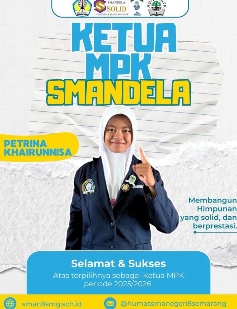 Ketua MPK SMA N 8 Semarang Periode 2025/2026 November 4, 2025 admin Selamat dan sukses atas terpilihnya Petrina Khairunnisa sebagai Ketua MPK SMA N 8 Semarang Periode 2025/2026