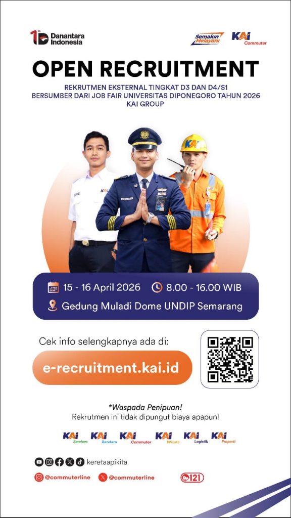 Semarang – Kabar baik bagi para pencari kerja! PT Kereta Api Indonesia (KAI) Group kembali membuka kesempatan berkarier melalui kegiatan Open Recruitment yang bersumber dari Job Fair Universitas Diponegoro Tahun 2026.
