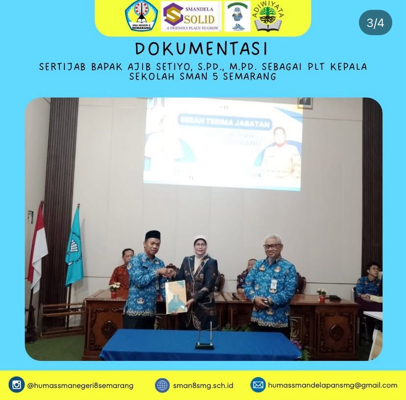 Sertijab Bapak Ajib Setiyo, S.Pd., M.Pd. Sebagai Plt. Kepala SMA N 8 Semarang dilaksanakan hari senin tanggal 1 desember 2025. Tongkat estafet kepemimpinan diserahkan. Selamat kepada Bapak Ajib Setiyo, S.Pd., M.Pd. sebagai Plt. Kepala SMA Negeri 5 Semarang. Semoga membawa perubahan yang penuh inspirasi!