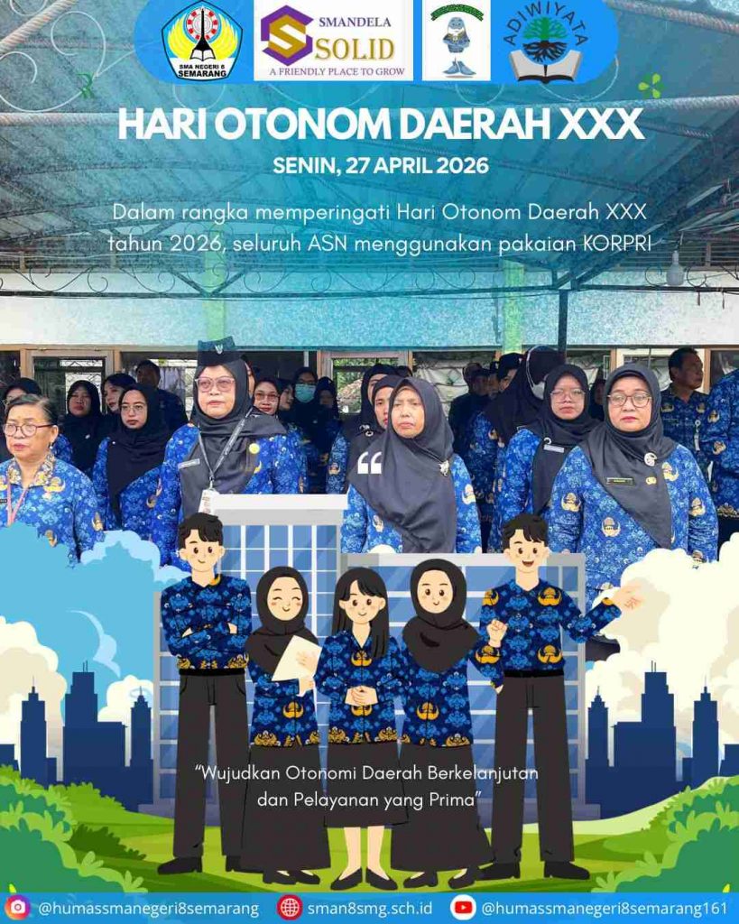 Semarang — SMA Negeri 8 Semarang melaksanakan apel dalam rangka memperingati Hari Otonomi Daerah yang jatuh pada tanggal 25 April 2026. Kegiatan apel dilaksanakan pada Senin, 27 April 2026, di lapangan sekolah dengan diikuti oleh seluruh warga sekolah, mulai dari siswa, guru, hingga tenaga kependidikan.